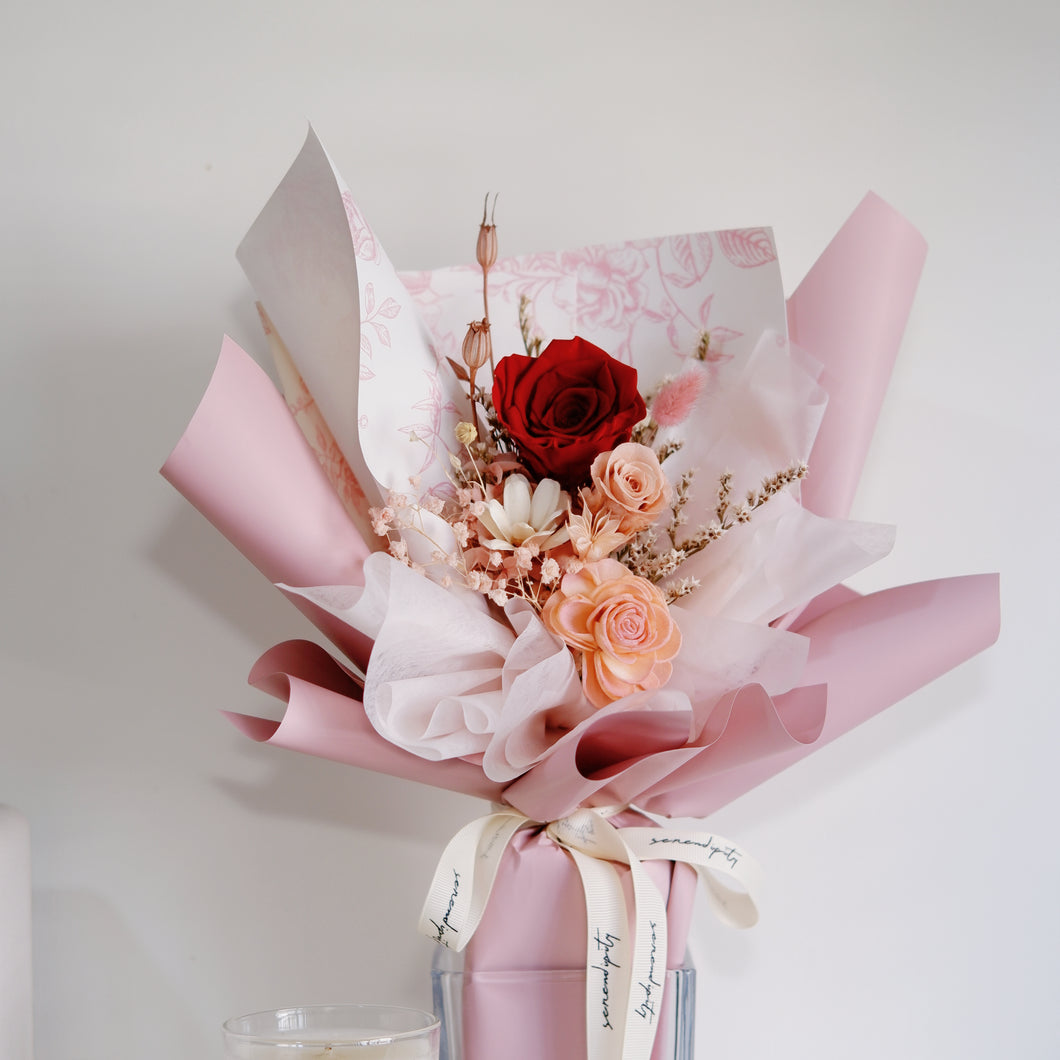 Centre around a signature red rose, softened with blush blooms and refined details. This bouquet balances tradition with modern minimalism - an enduring symbol of devotion, thoughtfully reimagined for today. These preserved flowers are obtained from natural, high-quality floral breeds and preserved using state-of-the-art technology. The technology allows the flora to maintain its natural beauty, texture and soft natural touch.